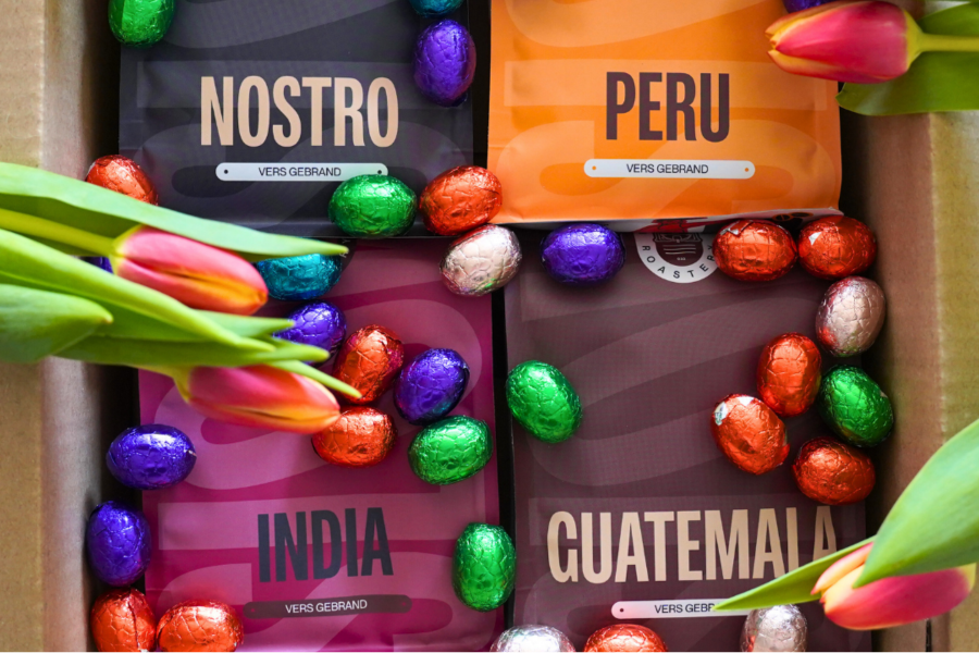 Bij Pasen horen chocolade paaseitjes én koffie die er perfect bij past. Proef nu chocolade in je kopje met onze tijdelijke Paasfavorieten Box: 4x 250g vers gebrande koffies met heerlijke chocoladetonen + gratis zakje van onze bestseller t.w.v. €11,95.