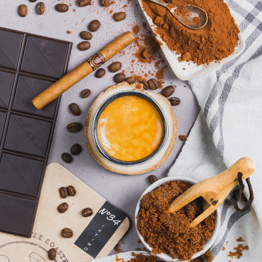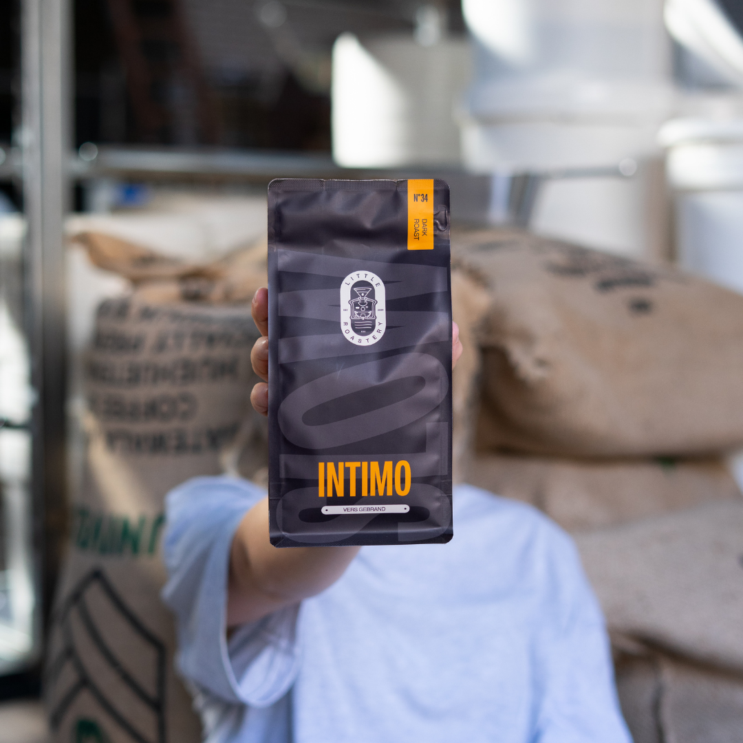 Nº34 Intimo is een blend van zorgvuldig geselecteerde Arabica en Canephora (Robusta) bonen uit Brazilië, Colombia en Vietnam. Deze samenstelling zorgt voor een volle body en een kruidige, diepe smaak. De langzame branding brengt tonen van pure chocolade, noten en een lichte kruidigheid naar voren, waardoor deze koffie zich heel goed leent voor espresso en cappuccino. Een krachtige, maar gebalanceerde koffie voor elk moment van de dag.
