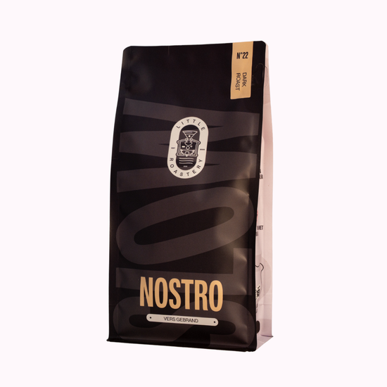 Nº22 Nostro is onze aller-eerste espressoblend, ontwikkeld voor liefhebbers van een stevige kop koffie. De basis bestaat uit Braziliaanse Arabica-bonen, aangevuld met Indiase Canephora (Robusta) die zorgt voor extra body en kruidige tonen. Het resultaat is een volle, intense espresso met smaken van pure chocolade, cacao en pinda.